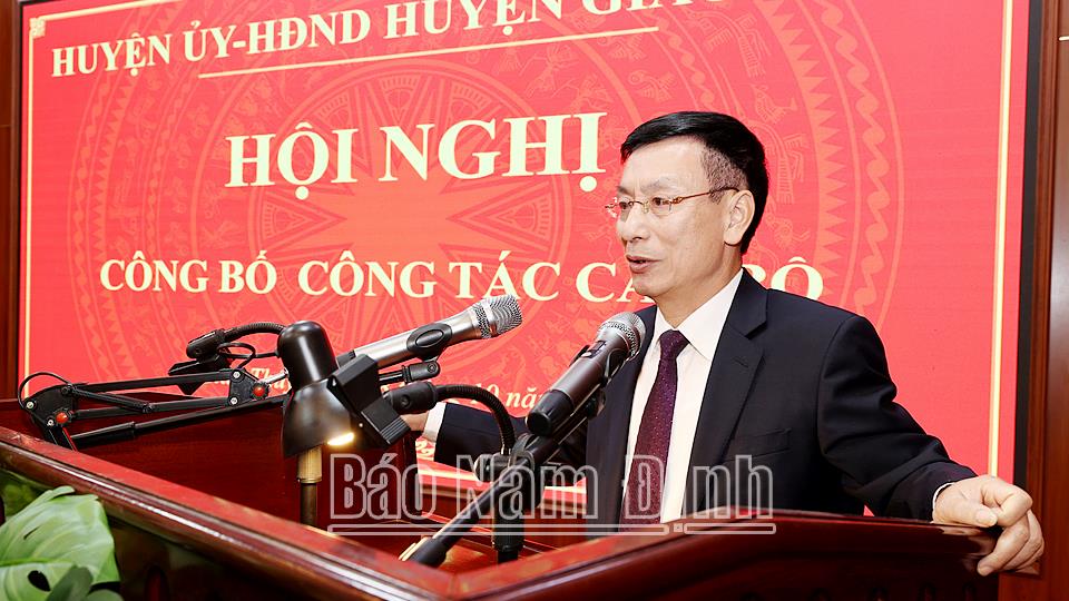 Sáng 28/10, Huyện ủy, HĐND huyện Giao Thủy tổ chức hội nghị công bố Nghị quyết của Thường trực HĐND tỉnh và Quyết định của Ban TVTU về công tác cán bộ. Dự hội nghị có các đồng chí: Phạm Đình Nghị, Phó Bí thư Tỉnh ủy, Chủ tịch UBND tỉnh; Mai Văn Quyết, Ủy viên Ban TVTU, Giám đốc Sở Kế hoạch và Đầu tư; Mai Thanh Long, TUV, Phó Chủ tịch HĐND tỉnh; lãnh đạo Ban Tổ chức Tỉnh ủy, Sở Nội vụ, Văn phòng Đoàn đại biểu Quốc hội và HĐND tỉnh, Văn phòng UBND tỉnh, huyện Giao Thủy.