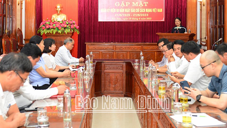 Nhân dịp kỷ niệm 98 năm Ngày Báo chí Cách mạng Việt Nam, chiều 19-6, Huyện ủy, HĐND, UBND huyện Hải Hậu đã tổ chức gặp mặt các cơ quan báo chí. Các đồng chí lãnh đạo huyện Hải Hậu; cán bộ, phóng viên, biên tập viên một số cơ quan báo chí Trung ương, địa phương hoạt động trên địa bàn tỉnh tham dự buổi gặp mặt.
