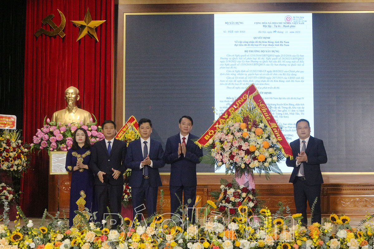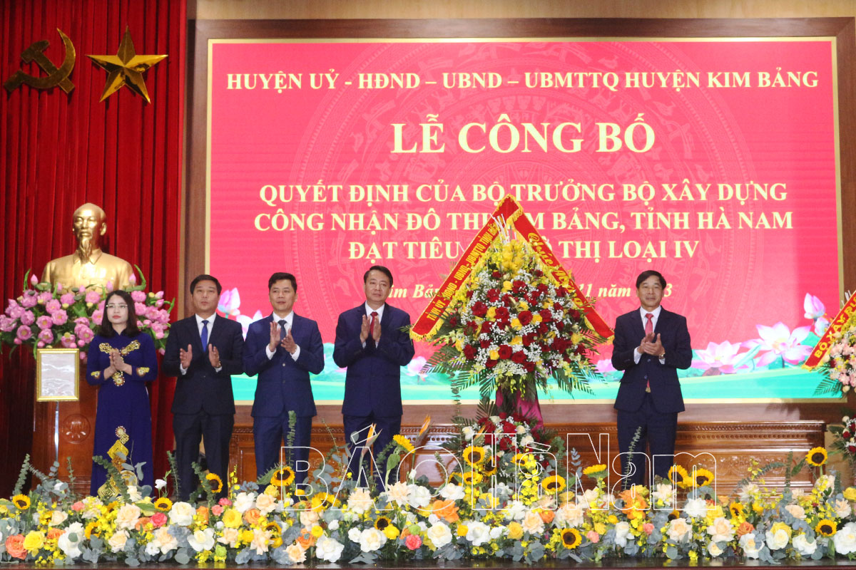 Sáng 14/11, Huyện uỷ, HĐND, UBND, Uỷ ban MTTQ huyện Kim Bảng long trọng tổ chức lễ công bố quyết định công nhận huyện đạt tiêu chí đô thị loại IV. Dự hội nghị có các đồng chí: Lê Hoàng Trung, Phó Cục trưởng Cục Phát triển đô thị (Bộ Xây dựng); Nguyễn Anh Chức, Ủy viên BTV Tỉnh uỷ, Phó Chủ tịch Thường trực UBND tỉnh; lãnh đạo một số sở, ban, ngành của tỉnh.