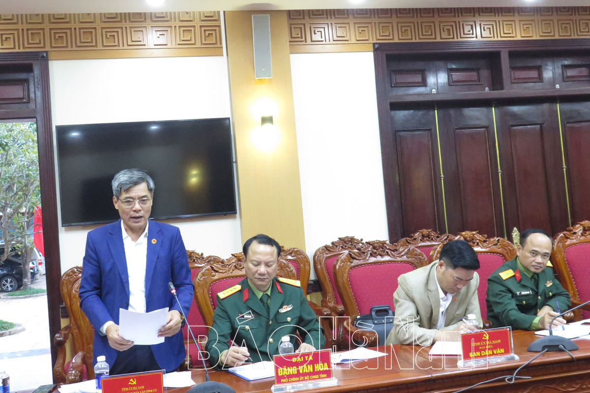 Đại diện Ban CHQS huyện Kim Bảng trình bày báo cáo sơ kết chương trình phối hợp hoạt động năm 2023.