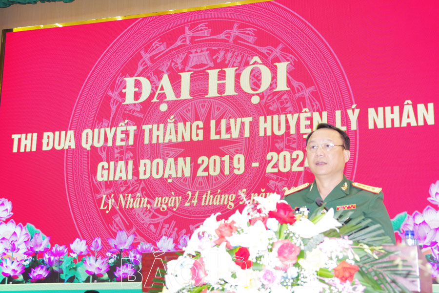 Phát biểu tại Đại hội, Đại tá Đặng Văn Hoà, Phó Chính uỷ Bộ CHQS tỉnh chúc mừng và biểu dương những kết quả, thành tích nổi bật trong phong trào TĐQT của LLVT huyện Lý Nhân. Đồng chí nhấn mạnh: thời gian tới đề nghị LLVT huyện Lý Nhân tập trung thực hiện tốt các quan điểm của Đảng, tư tưởng của Chủ tịch Hồ Chí Minh về thi đua ái quốc. Đoàn kết, chủ động khắc phục khó khăn, đổi mới phong trào TĐQT với nhiều nội dung thiết thực, sáng tạo, tạo sự chuyển biến vững chắc từ cơ sở. Quan tâm xây dựng nhân tố mới, nhân rộng điển hình tiên tiến làm cho phong trào thi đua thực sự trở thành động lực, biện pháp quan trọng trong xây dựng đội ngũ cán bộ, đảng viên, góp phần xây dựng tổ chức đảng hoàn thành xuất sắc nhiệm vụ, xây dựng đơn vị vững mạnh toàn diện “mẫu mực, tiêu biểu”.