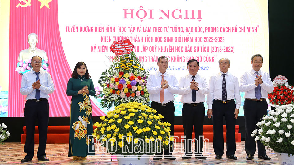 Thay mặt Tỉnh uỷ, HĐND, UBND tỉnh, đồng chí Phó Bí thư Thường trực Tỉnh ủy Lê Quốc Chỉnh đã trao tặng huyện Trực Ninh lẵng hoa tươi thắm; trao học bổng cho người lao động tiêu biểu trong phong trào “Học không bao giờ cùng”.