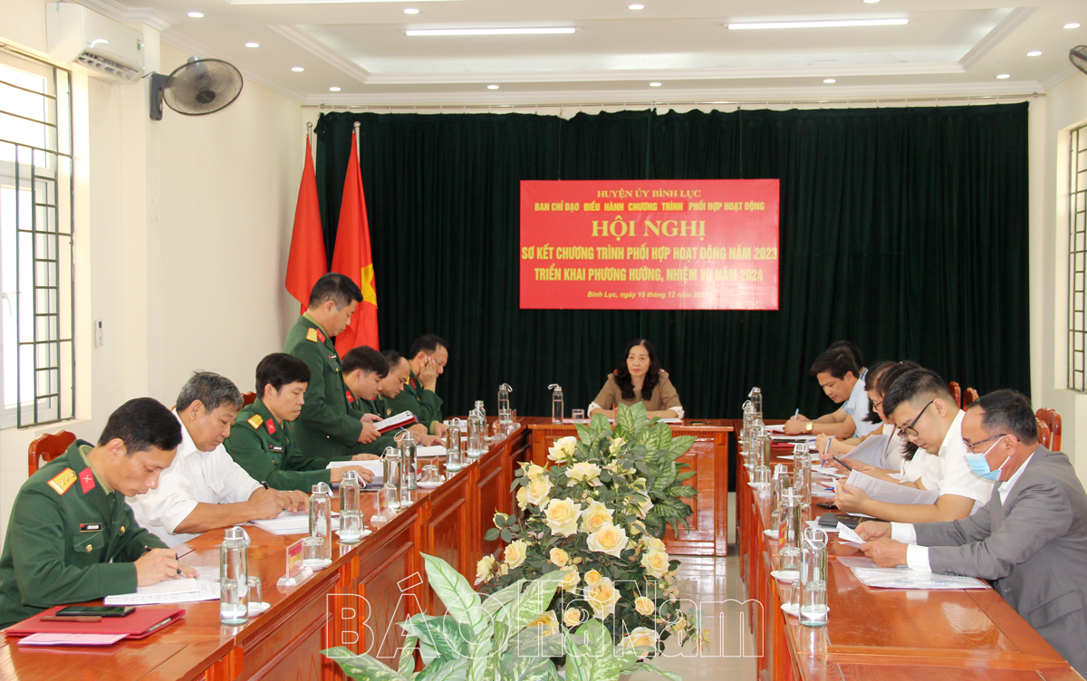 Chiều 15/12, Ban Chỉ đạo điều hành chương trình phối hợp huyện Bình Lục tổ chức hội nghị sơ kết chương trình phối hợp hoạt động (PHHĐ) giữa Ban Dân vận Huyện uỷ, Ban CHQS huyện, MTTQ và các tổ chức đoàn thể của huyện năm 2023, triển khai phương hướng, nhiệm vụ năm 2024.