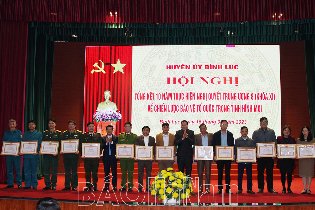 Nhân dịp này, Huyện ủy Bình Lục đã khen thưởng 15 tập thể, 16 cá nhân có thành tích xuất sắc trong thực hiện Nghị quyết Trung ương 8 (khóa XI) về “Chiến lược bảo vệ Tổ quốc trong tình hình mới”.