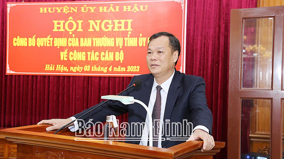 Tại hội nghị, lãnh đạo Ban Tổ chức Tỉnh ủy đã công bố Quyết định số 668-QĐ/TU ngày 28-3-2023 của Ban TVTU về việc chuẩn y kết quả bầu cử bổ sung Phó Bí thư Huyện ủy Hải Hậu cho đồng chí Đỗ Văn Mạnh, Ủy viên Ban Thường vụ Huyện ủy, Trưởng Ban Tổ chức Huyện ủy giữ chức vụ Phó Bí thư Huyện ủy nhiệm kỳ 2020-2025. Quyết định có hiệu lực từ ngày ký.