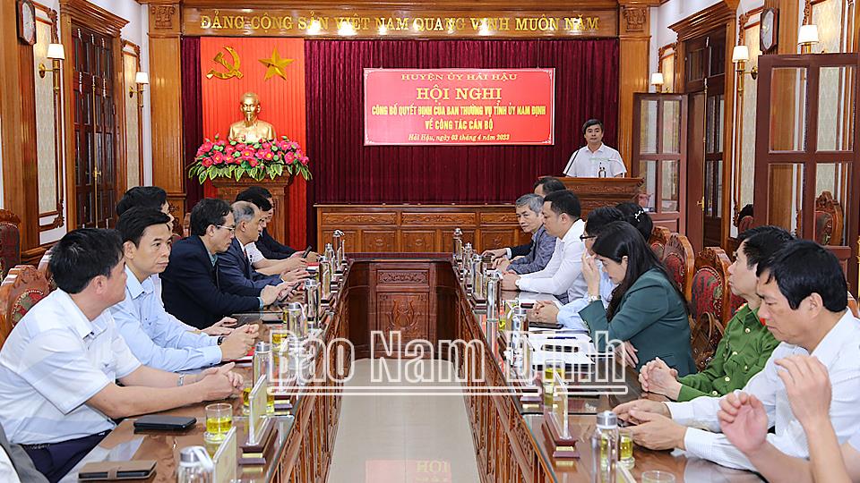 Sáng 3-4, Huyện ủy Hải Hậu tổ chức hội nghị công bố quyết định của Ban TVTU về công tác cán bộ. Đồng chí Lê Quốc Chỉnh, Phó Bí thư Thường trực Tỉnh ủy, Chủ tịch HĐND tỉnh, Trưởng đoàn Đoàn đại biểu Quốc hội tỉnh; lãnh đạo Ban Tổ chức Tỉnh ủy dự hội nghị.