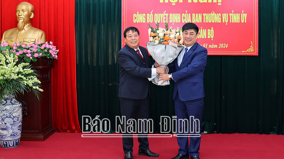 Đồng chí Phó Bí thư Thường trực Tỉnh ủy Lê Quốc Chỉnh trao Quyết định, tặng hoa chúc mừng đồng chí tân Bí thư Huyện ủy Nam Trực Lưu Quang Tuyển; đồng thời phát biểu nhấn mạnh, việc điều động, luân chuyển, bổ nhiệm cán bộ là việc làm thường xuyên của cấp ủy, tổ chức Đảng giúp cán bộ phấn đấu, rèn luyện, trưởng thành, đáp ứng yêu cầu công việc trước mắt và chuẩn bị nhân sự cho nhiệm kỳ mới 2025-2030.