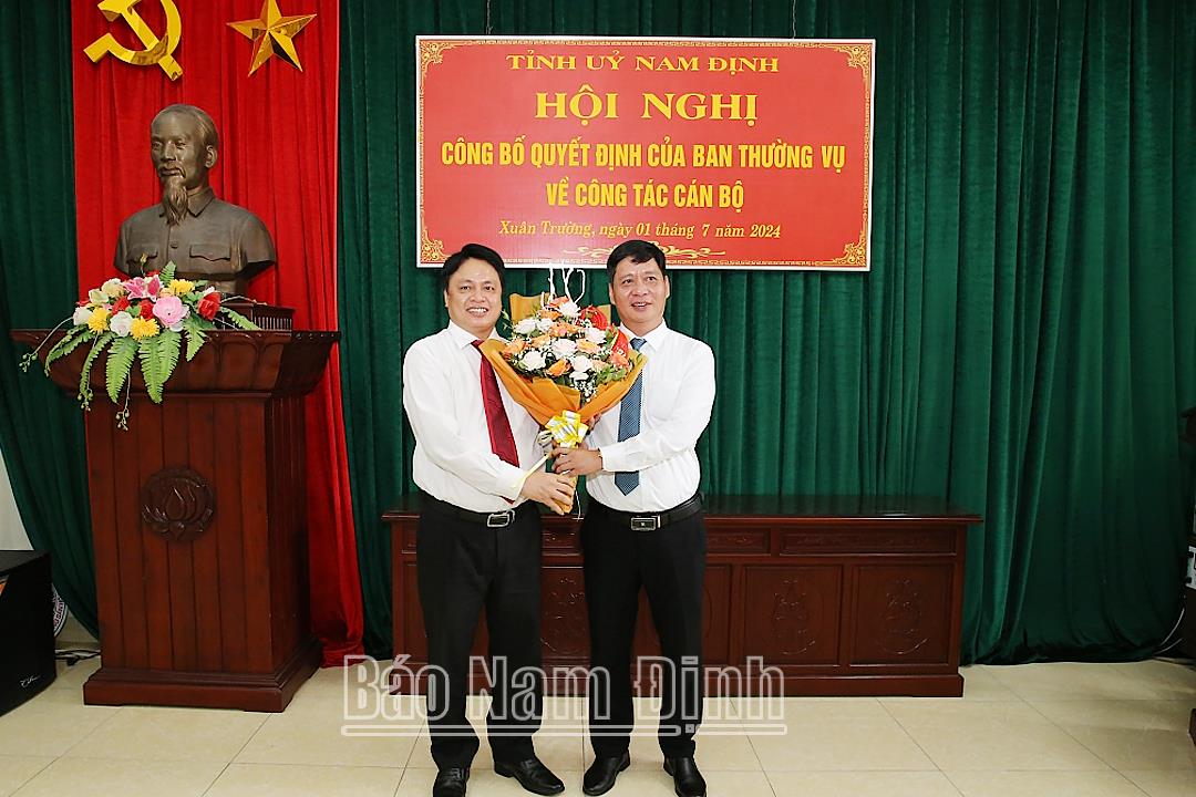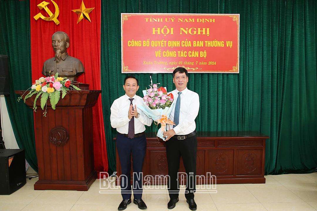 Sáng 1/7, Huyện ủy Xuân Trường tổ chức Hội nghị công bố Quyết định của Ban TVTU về công tác cán bộ. Dự hội nghị có các đồng chí: Lê Quốc Chỉnh, Phó Bí thư Thường trực Tỉnh ủy, Chủ tịch HĐND tỉnh, Trưởng đoàn Đoàn đại biểu Quốc hội tỉnh và các đồng chí Uỷ viên Ban TVTU: Nguyễn Phùng Hoan, Phó Chủ tịch Thường trực HĐND tỉnh; Trần Minh Thắng, Trưởng Ban Dân vận Tỉnh uỷ; lãnh đạo các Ban Xây dựng Đảng của Tỉnh ủy và huyện Xuân Trường.