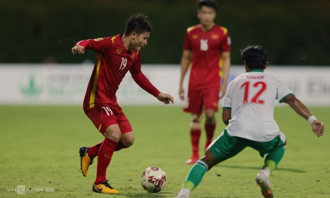 Quang Hải đi bóng trước Arhan trong trận Việt Nam hòa Indonesia 0-0 tại vòng bảng AFF Cup 2020.