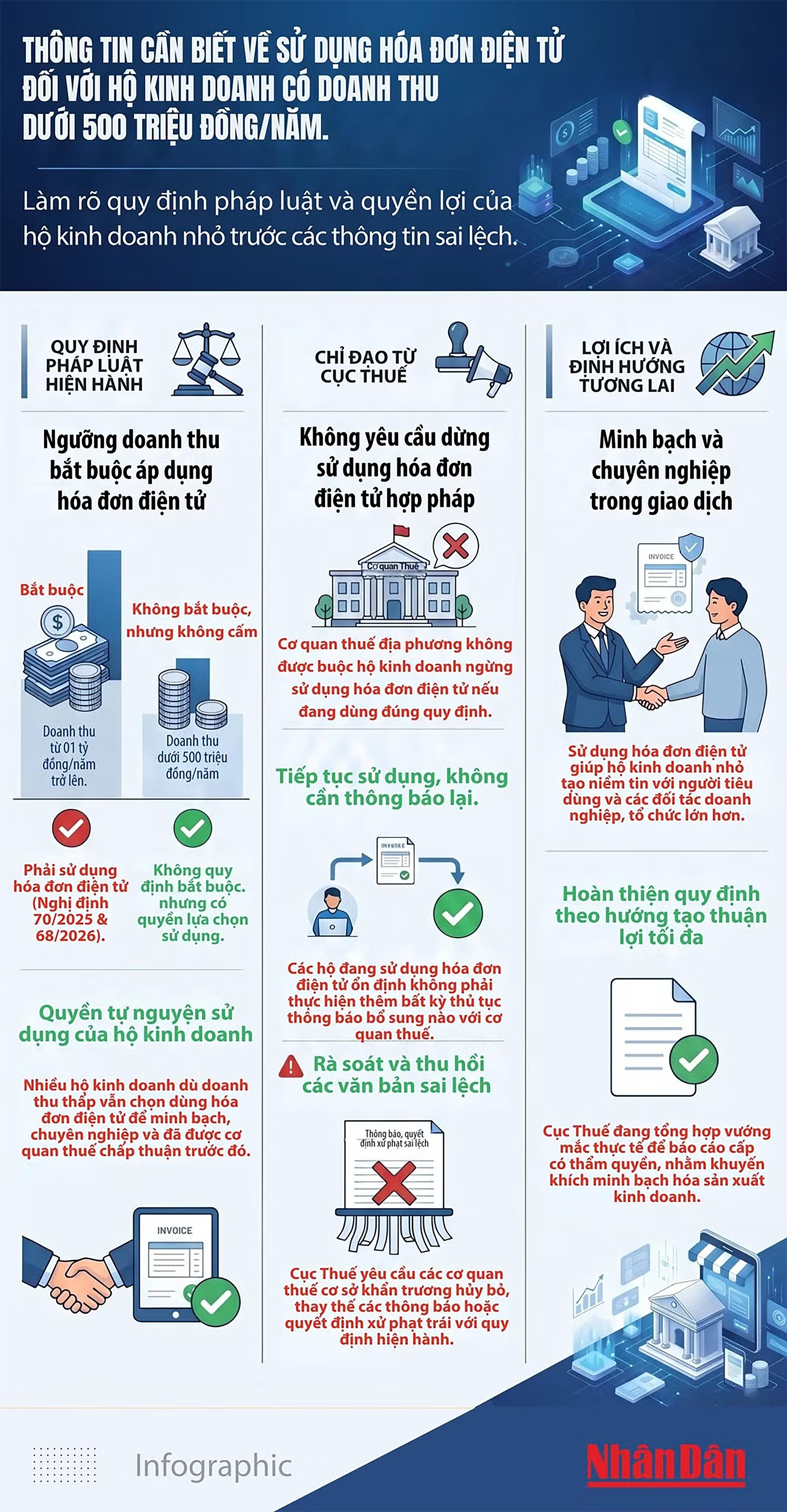 Cục Thuế khẳng định hộ kinh doanh có doanh thu dưới 500 triệu đồng/năm không thuộc diện bắt buộc sử dụng hóa đơn điện tử, nhưng vẫn được tiếp tục sử dụng nếu có nhu cầu hợp pháp; đồng thời yêu cầu các địa phương chấn chỉnh hướng dẫn, bảo đảm thống nhất, tránh gây hiểu nhầm cho người nộp thuế.