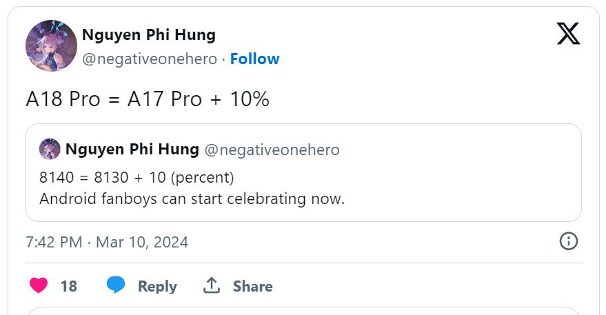 Tin tức được tiết lộ từ nguồn @negativeonehero (Nguyen Phi Hung) trên X cho thấy, chip A18 Pro có hiệu năng chỉ tăng 10% so với A17 Pro trên iPhone 15 Pro ra mắt năm ngoái.