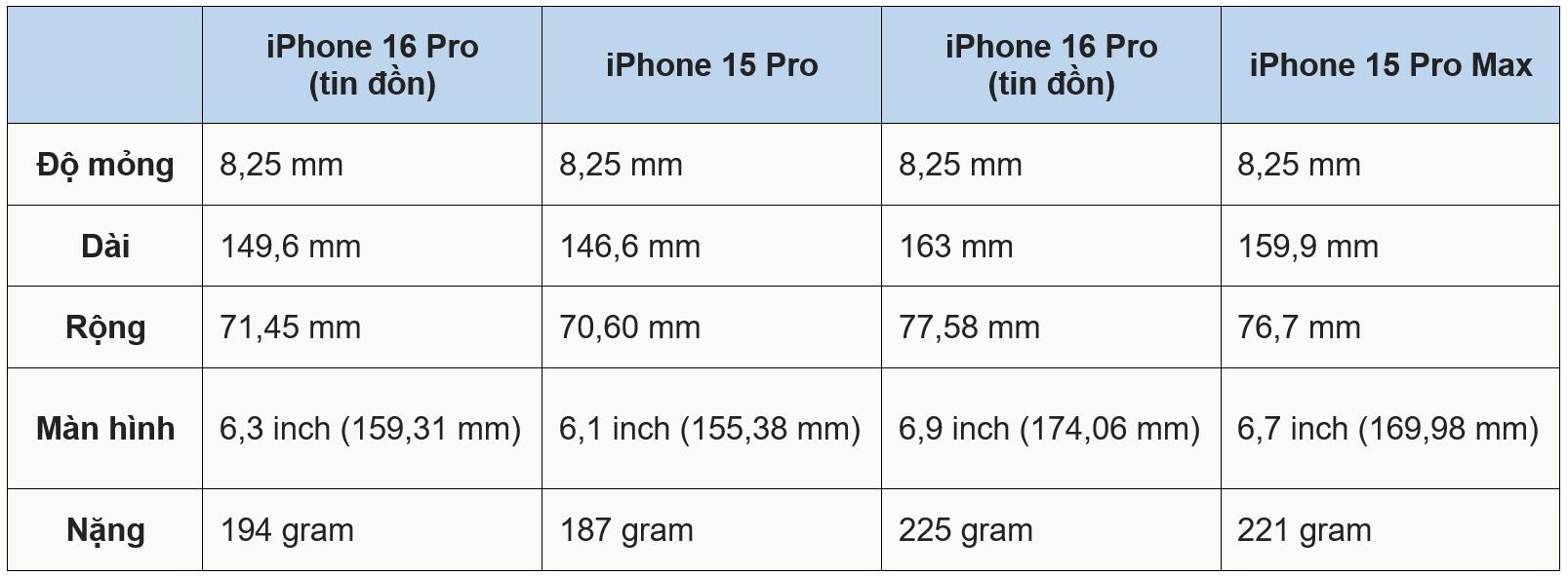 Chi tiết kích thước của Phone 16 Pro và iPhone 16 Pro Max theo tin tức rò rỉ mới nhất.