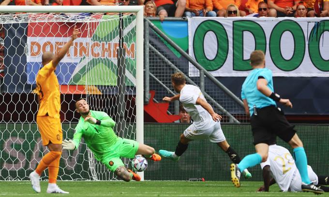 Dimarco tiếp tục màn trình diễn xuất sắc trong hiệp một khi cú sút từ ngoài vòng cấm của anh suýt tạo ra siêu phẩm. Ở khung thành bên kia, pha hãm thành nguy hiểm nhất của Hà Lan thuộc về Cody Gakpo. Nhưng pha cứa lòng trong thế đối mặt của tiền đạo thuộc biên chế Liverpool chỉ chệch cột. HLV Ronald Koeman tỏ ra rất thất vọng khi chứng kiến pha bỏ lỡ này.