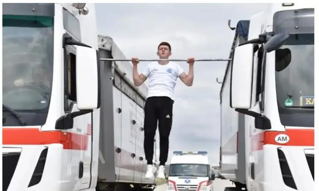 Một thanh niên Armenia đã thể hiện sức mạnh phần thân trên của mình bằng cách thực hiện 44 động tác kéo xà đơn trên một thanh xà đặt giữa hai xe tải đang di chuyển.