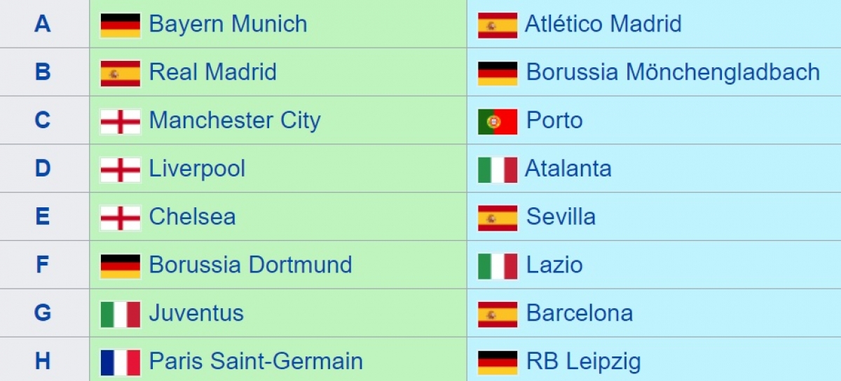 Như vậy, Ban tổ chức đã xác định được 16 đội bóng giành tấm vé vào chơi ở vòng 1/8 Champions League 2020/2021 gồm: Bayern Munich; Atletico Madrid (bảng A); Real Madrid, Borussia M.Gladbach (bảng B); Man City, Porto (bảng C); Liverpool, Atalanta (bảng D); Chelsea, Sevilla (bảng E); Dortmund, Lazio (bảng F); Juventus, Barca (bảng G); PSG, RB Leipzig (bảng H).