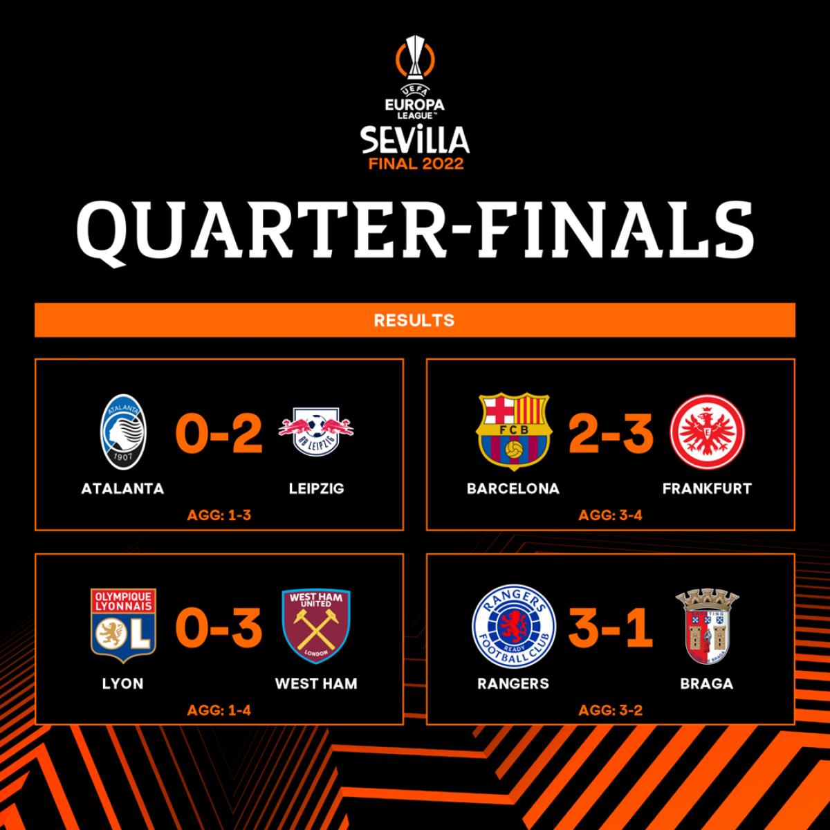 Ở nhánh đấu còn lại, Leipzig vượt qua Atalanta 2-0 trong trận lượt nhờ cú đúp của Christopher Nkunku (18’, 87’ penalty) và tiến vào bán kết với tổng tỷ số 3-1. Trong khi đó, Ranger thắng 3-1 sau 120 phút thi đấu ở lượt về để lật ngược tình thế, khi đã thua Braga 0-1 tại lượt đi.