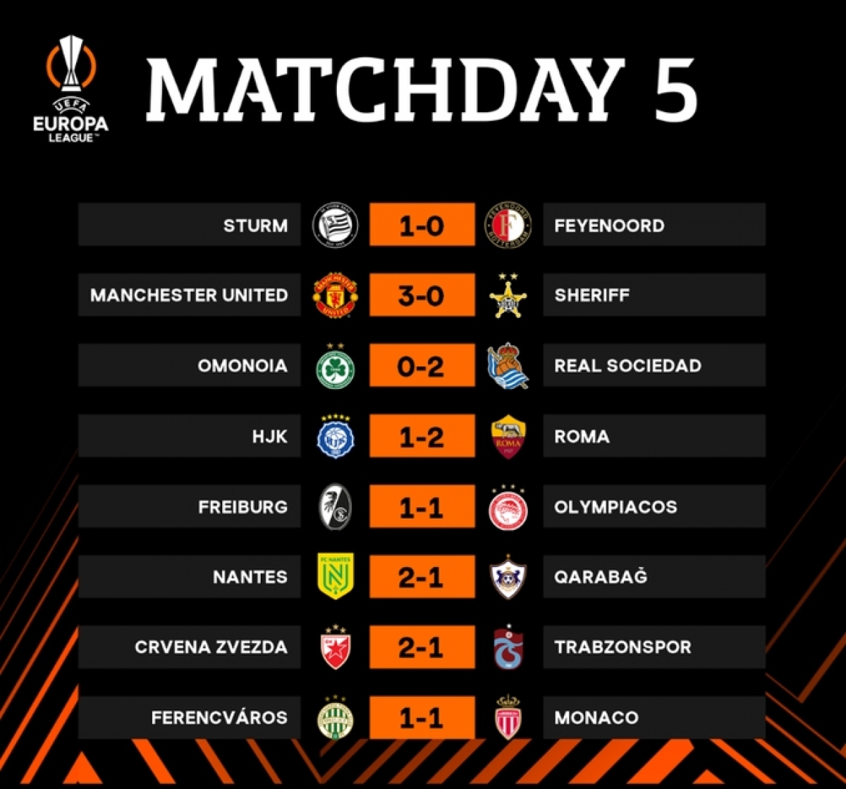 Chung cuộc, MU giành chiến thắng 3-0 trước FC Sheriff. Với chiến thắng này, MU có được 12 điểm/5 trận, kém Real Sociedad 3 điểm. Cả MU và Real Sociedad đều có vé đi tiếp, nhưng ngôi nhất bảng sẽ được xác định sau lượt trận cuối cùng, khi hai đội so tài trực tiếp với nhau./.