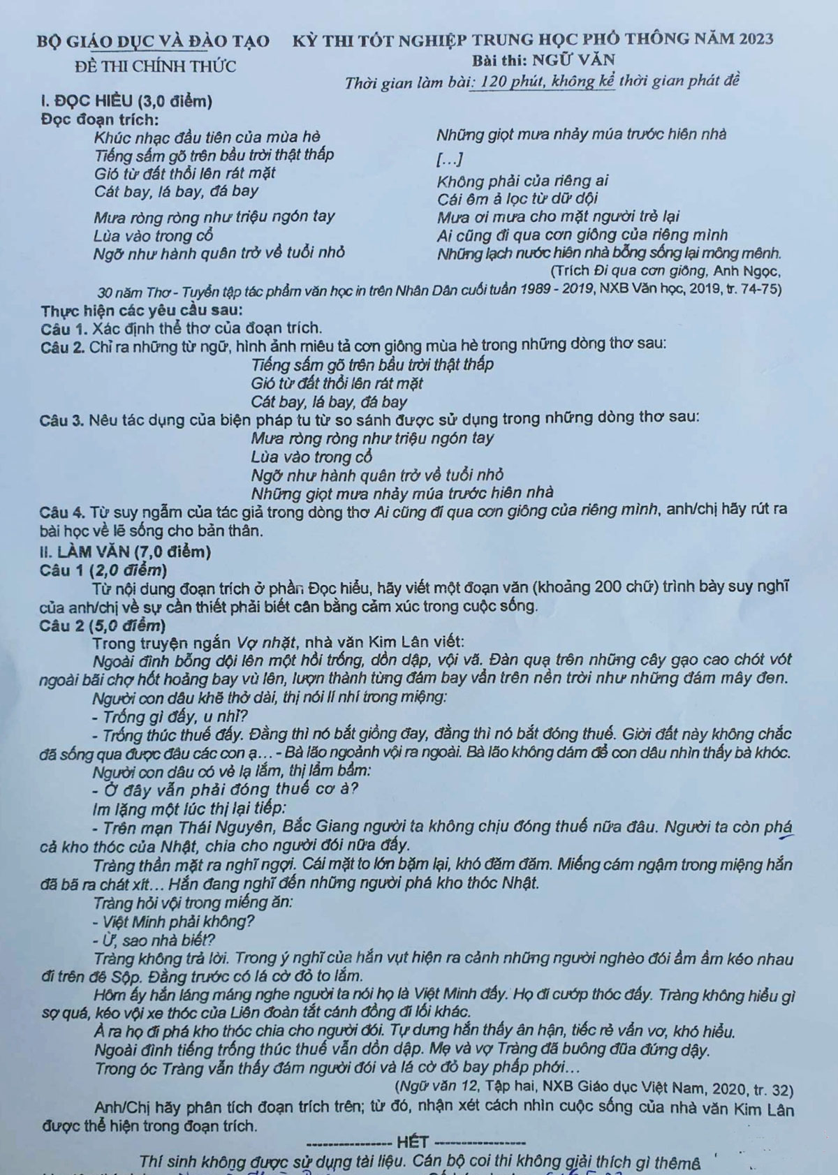 Đề thi Ngữ văn kỳ thi Tốt nghiệp THPT năm 2023.