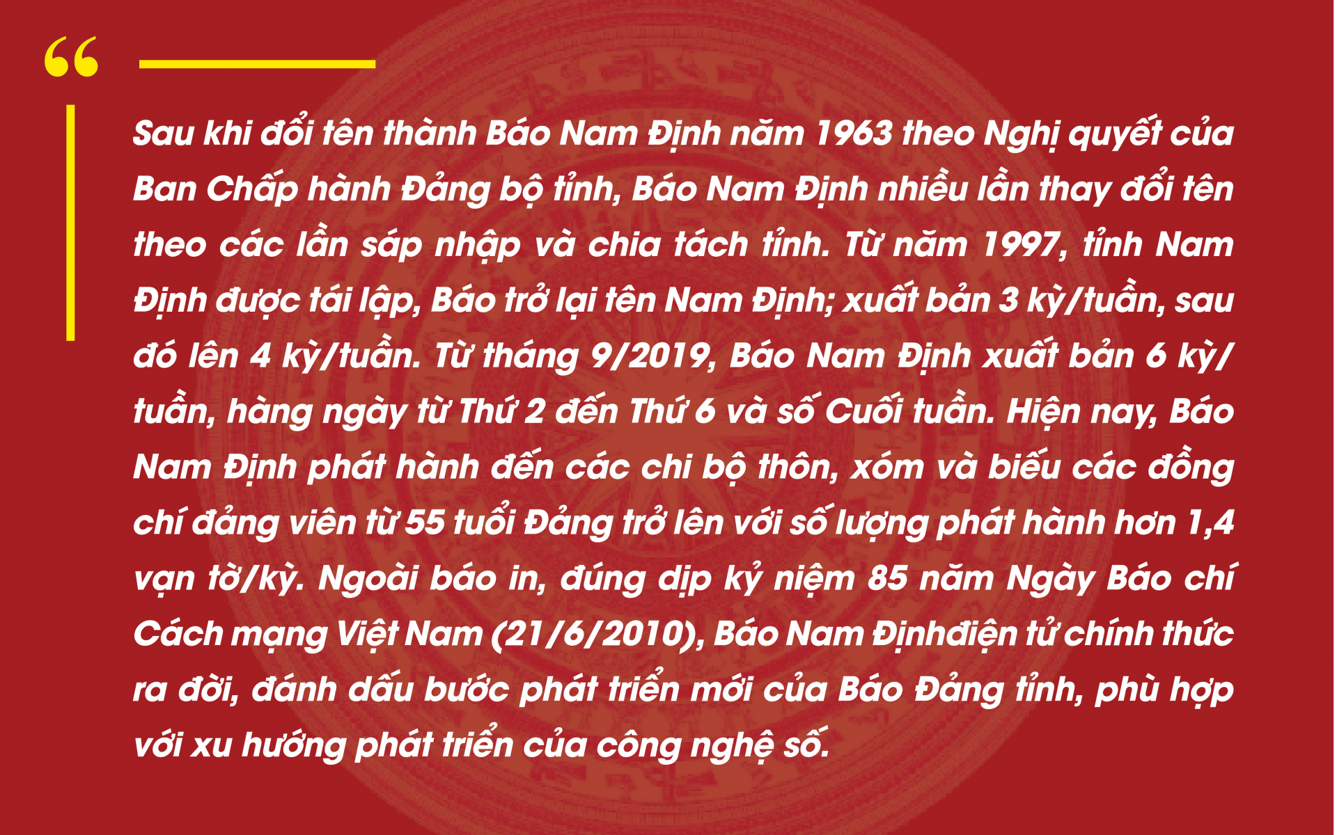 Phát huy những thành quả của các thế hệ đi trước, bám sát tôn chỉ mục đích là cơ quan ngôn luận của Đảng bộ tỉnh, Báo Nam Định tiếp tục thực hiện tốt nhiệm vụ thông tin, tuyên truyền chủ trương, đường lối của Đảng, chính sách, pháp luật của Nhà nước, của tỉnh; thông tin đầy đủ, kịp thời tình hình trong nước và quốc tế; phản ánh mọi mặt đời sống xã hội; phát huy những giá trị tốt đẹp, nhân tố mới, mô hình hiệu quả, cách làm hay; biểu dương gương người tốt, việc tốt; phản bác những luận điệu xuyên tạc, sai trái, tiêu cực, góp phần tích cực đấu tranh phòng, chống tham nhũng, lãng phí; đấu tranh và phê phán những biểu hiện suy thoái về đạo đức, lối sống. Tích cực đẩy mạnh truyền thông chính sách; thông tin định hướng kịp thời quá trình triển khai các dự án lớn trên địa bàn, qua đó tạo sự đồng thuận, thống nhất trong cả hệ thống chính trị và các tầng lớp nhân dân, góp phần quan trọng thực hiện thắng lợi nhiệm vụ chính trị, phát triển kinh tế - xã hội, đảm bảo quốc phòng, an ninh của tỉnh.