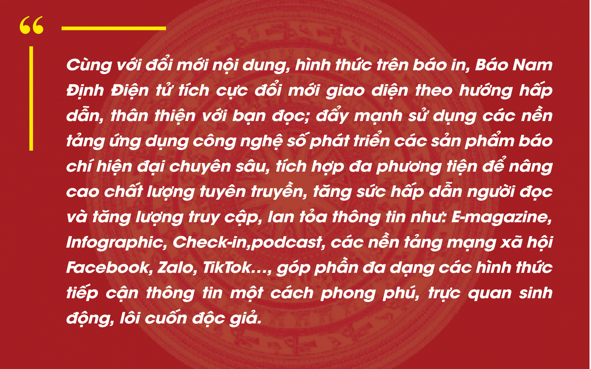 Ban Biên tập, cán bộ, phóng viên Báo Nam Định đã nhanh chóng tiếp cận và thực hiện các yêu cầu đổi mới về nội dung và hình thức Báo Nam Định in, báo điện tử, cách thức tuyên truyền, đề tài, sử dụng thể loại báo chí hiện đại đa phương tiện. Sự đổi mới tuyên truyền về nội dung và hình thức được các đồng chí lãnh đạo tỉnh và bạn đọc ghi nhận, tin tưởng, đánh giá cao. Nhất là các tuyến bài, chuyên đề báo chí viết về đề tài xây dựng Đảng; Chỉ thị số 05-CT/TW và Kết luận 01-KL/TW của Bộ Chính trị về đẩy mạnh học tập và làm theo tư tưởng, đạo đức, phong cách Hồ Chí Minh gắn với Nghị quyết Trung ương 4 (khóa XII, khóa XIII) về xây dựng, chỉnh đốn Đảng; bảo vệ nền tảng tư tưởng của Đảng; đấu tranh phòng, chống tham nhũng, lãng phí; thông tin đối ngoại…, nhiều tác phẩm có chất lượng, đạt giải cao.