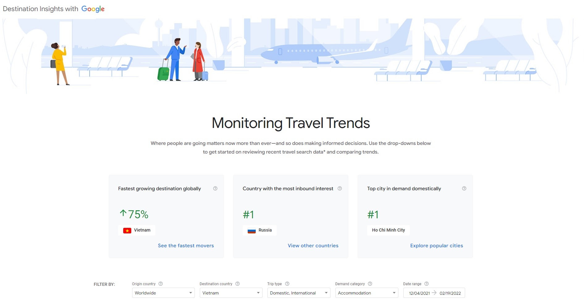 Theo báo cáo từ công cụ phân tích dữ liệu du lịch Google Destination Insights, lượng tìm kiếm của du khách quốc tế đối với hàng không và lưu trú du lịch Việt Nam tăng trưởng cao nhất trên toàn thế giới.