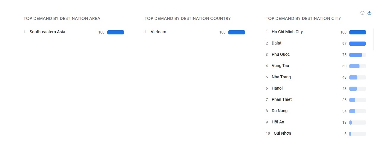 Mười điểm đến của Việt Nam được tìm kiếm nhiều nhất bao gồm: Sài Gòn, Đà Lạt, Phú Quốc, Vũng Tàu, Nha Trang, Hà Nội, Phan Thiết, Đà Nẵng, Hội An và Quy Nhơn.