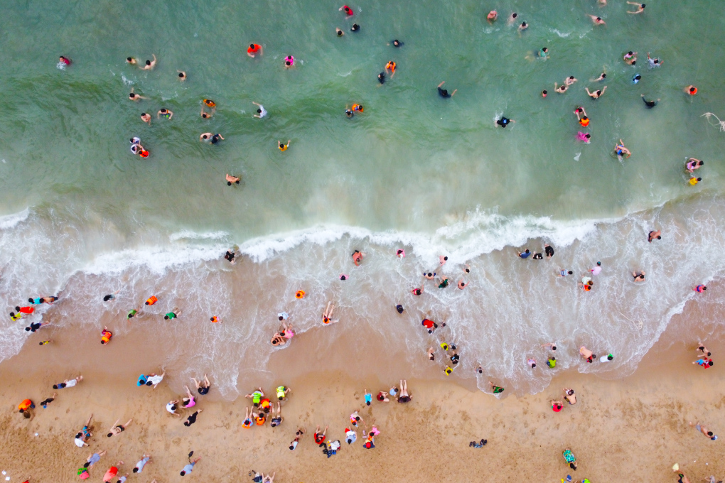 Một góc biển đông người tắm ở bãi biển Trần Phú từ trên cao dịp 30/4/2023. Ảnh: Bùi Toàn
