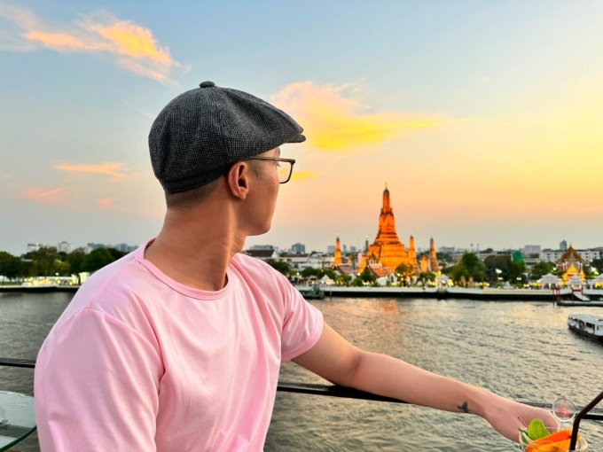 Khách Việt ngắm chùa Wat Arun và hoàng hôn từ sông Chao Phraya, Bangkok. Ảnh: Đăng Nguyễn