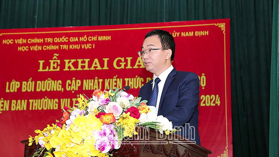 Ngày 14/10, tại Trường Chính trị Trường Chinh, Học viện Chính trị Khu vực I (Học viện Chính trị quốc gia Hồ Chí Minh) phối hợp với Tỉnh ủy Nam Định tổ chức khai giảng lớp bồi dưỡng, cập nhật kiến thức đối với cán bộ diện Ban TVTU quản lý năm 2024 (Lớp thứ hai). Dự lễ khai giảng có các đồng chí: PGS.TS Nguyễn Ngọc Toàn, Phó Giám đốc Học viện Chính trị Khu vực I; Nguyễn Văn Va, Ủy viên Ban TVTU, Trưởng Ban Tổ chức Tỉnh ủy; lãnh đạo các sở, ban, ngành, các huyện, thành phố đến dự.