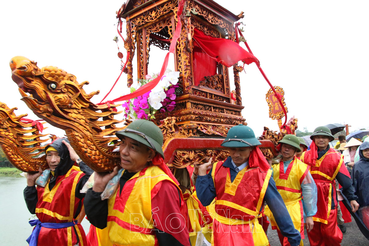 Trời mưa rét nhưng hàng trăm người dân Hương Cát vẫn long trọng thực hiện nghi thức rước kiệu thánh về Đình.