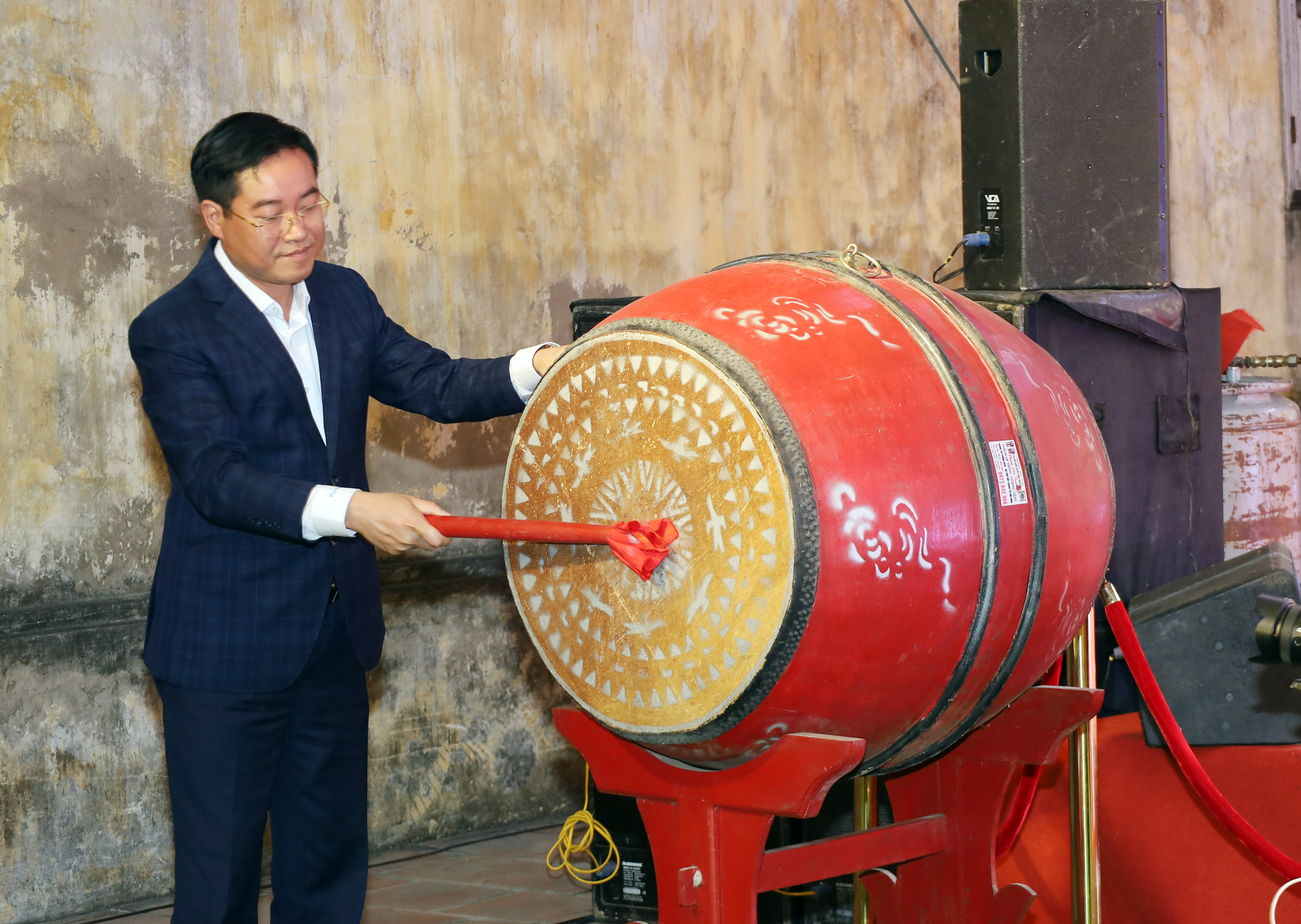 Đồng chí Trần Đức Thuấn, TUV, Bí thư Huyện ủy Lý Nhân đánh trống khai mạc lễ hội.