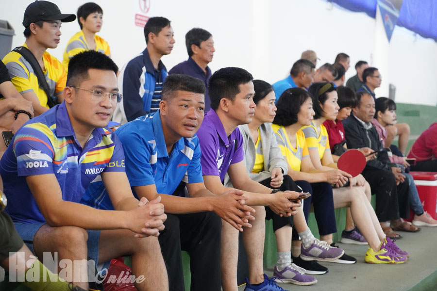 Đồng chí Lê Văn Quyết, Chủ tịch Liên đoàn Bóng bàn tỉnh Hà Nam tặng hoa chúc mừng Ban tổ chức giảiMột trận thi đấu nội dung đơn nữ dưới 45 tuổi diễn ra ngay sau lễ khai mạcCác vận động viên và khán giả theo dõi các trận thi đấu tại giải năm nayMột gương mặt nữ trẻ tham gia tại giải Bóng bàn Cúp Báo Hà Nam lần thứ X năm 2020