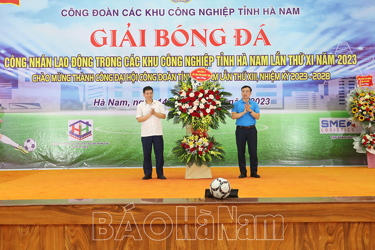 Lãnh đạo LĐLĐ tỉnh tặng hoa chúc mừng Ban tổ chức giải.Lãnh đạo Ban Quản lý các KCN tỉnh tặng hoa chúc mừng giải đấu.