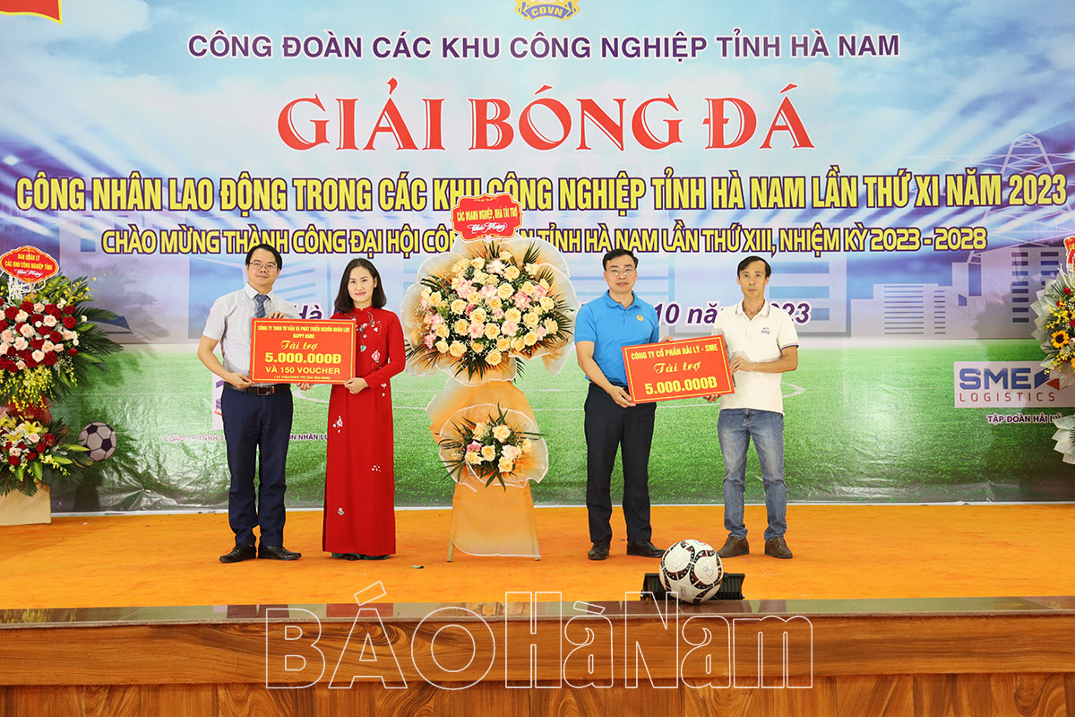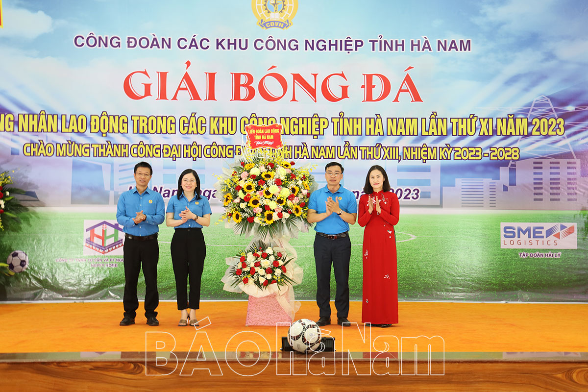 Lãnh đạo LĐLĐ tỉnh, Công đoàn các KCN tỉnh tặng hoa và cờ lưu niệm các đơn vị tham dự giải.