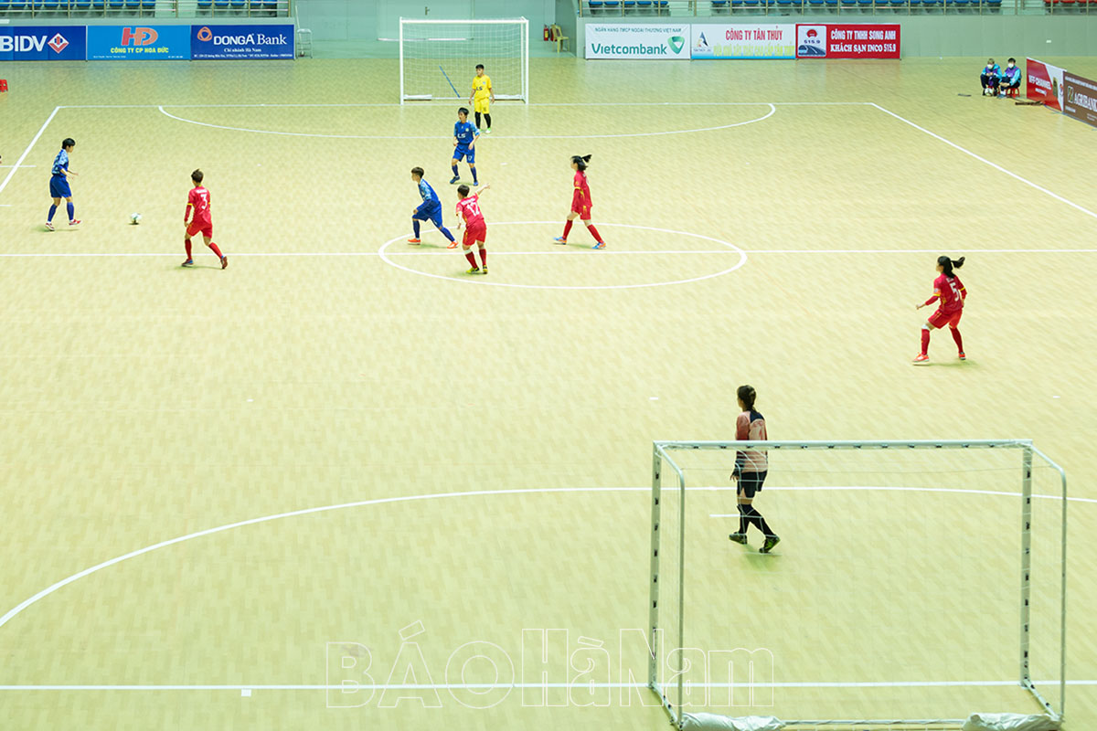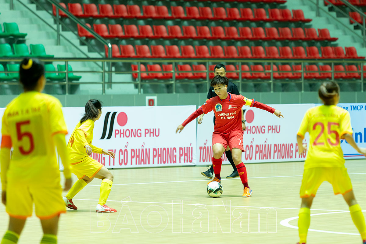 CLB Phong Phú Hà Nam 1 và Phong Phú Hà Nam 2 làm thủ tục trước trận đấu.Cầu thủ Tuyết Dung mang băng đội trưởng Phong Phú Hà Nam 1.