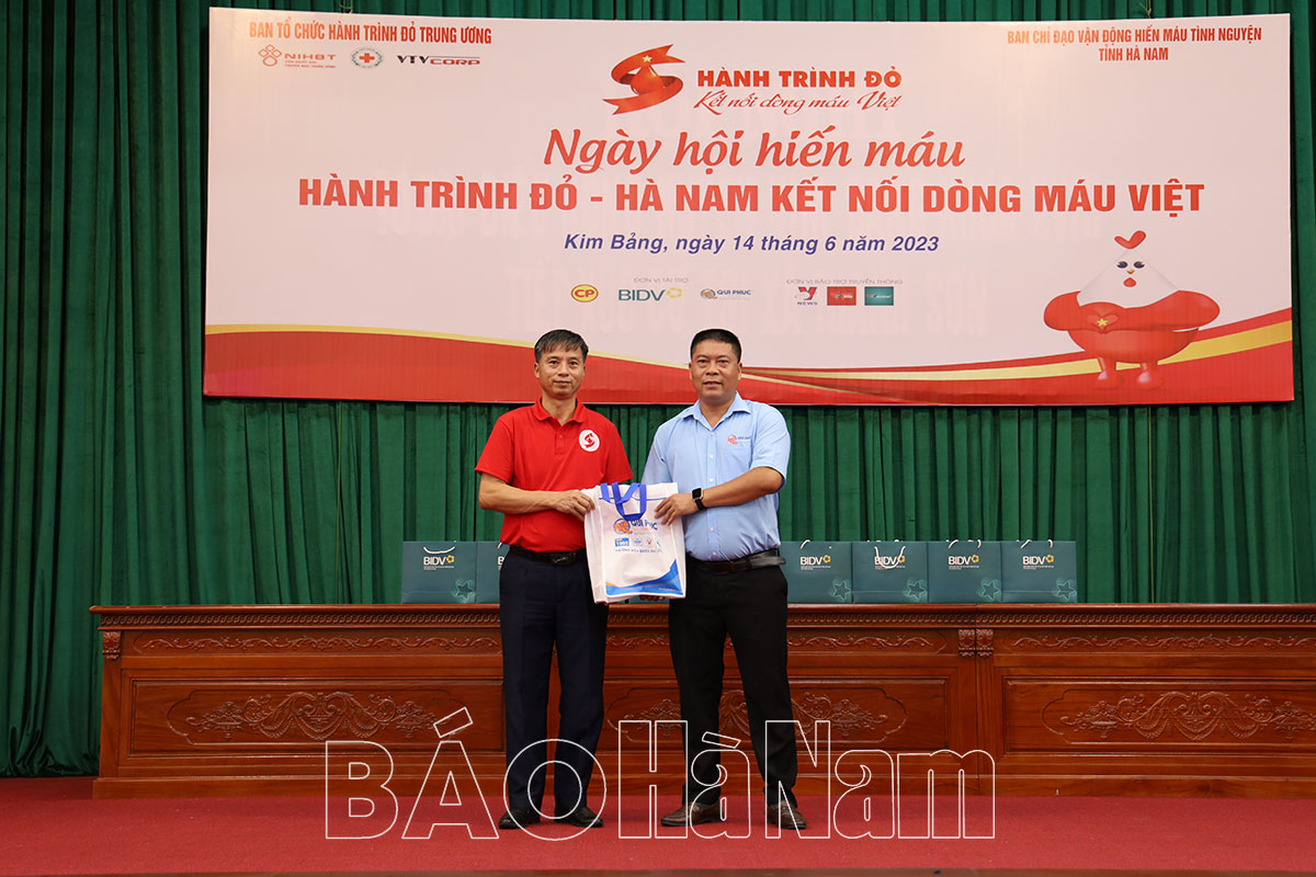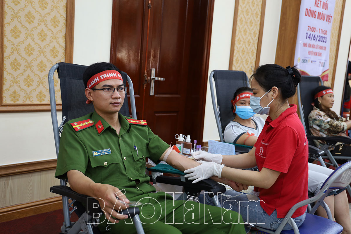 Lãnh đạo Ban Dân vận Tỉnh ủy, Hội CTĐ, Tỉnh đoàn động viên các tình nguyện viên tại ngày hội.Tình nguyện viên huyện Kim Bảng tham gia hiến máu hưởng ứng Hành trình đỏ năm 2023.