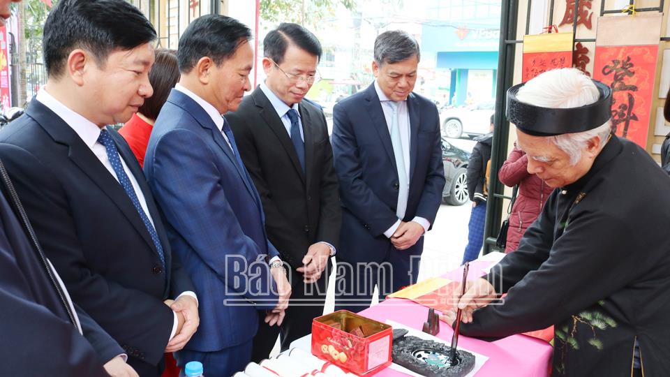 | Các đồng chí lãnh đạo tỉnh tham quan khu trưng bày, triển lãm viết chữ thư pháp. |