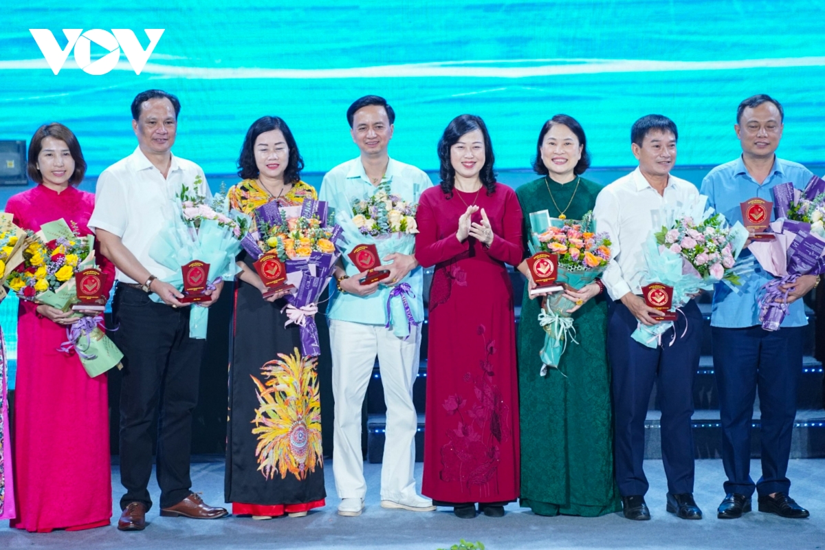 Bí thư Tỉnh ủy Bắc Ninh Đào Hồng Lan cùng đại diện các lãnh đạo tặng hoa chúc mừng các đoàn tham dự Hội diễn "Tiếng hát công nhân, người lao động năm 2022" tại Bắc Ninh.