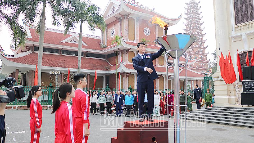 | Đồng chí Chủ tịch UBND huyện Hải Hậu Trần Thế Anh thắp lửa truyền thống Hội khoẻ Phù Đổng huyện. |