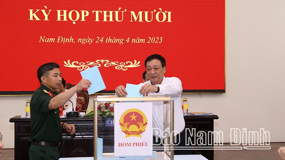 HĐND tỉnh đã biểu quyết thông qua 70 nghị quyết; trong đó 64 nghị quyết về kinh tế - xã hội, 6 nghị quyết về công tác cán bộ. Cụ thể, các nghị quyết về kinh tế - xã hội gồm: việc điều chỉnh Kế hoạch đầu tư công năm 2022; tạm giao biên chế công chức quản lý hành chính nhà nước, số lượng người làm việc hưởng lương từ ngân sách nhà nước trong các đơn vị sự nghiệp công lập chưa tự bảo đảm chi thường xuyên, các tổ chức Hội của tỉnh Nam Định năm 2023 và phân bổ bổ sung biên chế sự nghiệp giáo dục mầm non, phổ thông công lập năm học 2022-2023; quy định mức hỗ trợ kinh phí sự nghiệp từ nguồn ngân sách Trung ương thực hiện Chương trình mục tiêu quốc gia xây dựng nông thôn mới giai đoạn 2021-2025 trên địa bàn tỉnh Nam Định; quy định mức phân bổ, nội dung chi, mức chi phục vụ công tác đảm bảo trật tự an toàn giao thông từ nguồn thu xử phạt vi phạm hành chính trong lĩnh vực an toàn giao thông; quy định mức thu học phí đối với cơ sở giáo dục mầm non, phổ thông công lập do tỉnh Nam Định quản lý; thông qua hệ số điều chỉnh giá đất năm 2023 trên địa bàn tỉnh Nam Định; thông qua giá cụ thể sản phẩm, dịch vụ công ích thủy lợi năm 2022 trên địa bàn tỉnh Nam Định; thông qua dự thảo nghị quyết sửa đổi, bổ sung một số điều, khoản của Quy định một số chế độ, chính sách và điều kiện bảo đảm hoạt động của HĐND các cấp tỉnh Nam Định được ban hành kèm theo Nghị quyết số 30/2016/NQ-HĐND ngày 14-12-2026; kéo dài thời gian thực hiện và giải ngân kế hoạch vốn đầu tư công nguồn ngân sách địa phương năm 2022 sang năm 2023; danh mục dự án bố trí vốn ngân sách địa phương quá thời gian quy định chuyển tiếp sang giai đoạn 2021-2025; kéo dài thời kỳ quy hoạch khai thác cát trên địa bàn tỉnh Nam Định đến năm 2020 đến khi Quy hoạch tỉnh Nam Định thời kỳ 2021-2030, tầm nhìn đến năm 2050 được phê duyệt và điều chỉnh, bổ sung mục đích sử dụng cát; bổ sung danh mục các công trình, dự án phải thu hồi đất phải thu hồi đất năm 2023 trên địa bàn tỉnh Nam Định và hủy bỏ một số công trình, dự án; bổ sung công trình, danh mục dự án chuyển mục đích sử dụng dưới 10ha đất trồng lúa sang mục đích khác năm 2023 trên địa bàn tỉnh; thông qua Chương trình phát triển nhà ở tỉnh Nam Định giai đoạn 2021-2030; thông qua đồ án Quy hoạch phân khu xây dựng khu công nghiệp Trung Thành, huyện Ý Yên; bãi bỏ Nghị quyết số 12/2022/NQ-HĐND ngày 26-4-2022 của HĐND tỉnh về quy định mức thu, chế độ thu, nộp và quản lý lệ phí đăng ký cư trú trên địa bàn tỉnh Nam Định. Điều chỉnh chủ trương đầu tư dự án xây dựng khu dân cư tập trung các xã: Hải Phương, Hải Ninh, Hải Lộc, Hải Quang, Hải Bắc, Hải Đông (Hải Hậu); Nam sông Hồng, xã Giao Thiện (Giao Thủy); Vạn Diệp, xã Nam Phong và Lương Xá, phường Lộc Hòa (thành phố Nam Định); Yên Phương, Yên Cường (Ý Yên); xã Kim Thái, thị trấn Gôi, Vĩnh Hào (Vụ Bản); khu tái định cư và khu dân cư tập trung thị trấn Ninh Cường, khu đô thị thị trấn Cát Thành (Trực Ninh); khu dân cư tập trung thị trấn Quỹ Nhất (Nghĩa Hưng); dự án cải tạo, nâng cấp đường Phú - Ninh (Hải Hậu); dự án xây dựng tuyến đường huyện nối từ đê tả Đáy đến đường 57B (Ý Yên); dự án xây dựng nhà làm việc phòng Cảnh sát điều tra tội phạm về ma túy, hình sự, văn phòng cơ quan Cảnh sát điều tra và các hạng mục phụ trợ thuộc Công an tỉnh Nam Định; dự án Cải tạo, nâng cấp đường Long - Sơn (Hải Hậu). Điều chỉnh chủ trương đầu tư các dự án: dự án xây dựng khu dân cư tập trung xã Liên Bảo (thôn Đắc Lực), xã Đại Thắng, xã Liên Minh (Cửa Chùa Tứ Giáp), xã Quang Trung, xã Hợp Hưng (Đồng Thuần Khả Chính, Đồng Sóng Đồng Lạc), xã Tân Khánh (Chằm Cả), huyện Vụ Bản; khu dân cư tập trung xóm Duyên Trường, xã Giao Nhân (Giao Thủy); khu tái định cư và khu dân cư tập trung các xã Xuân Kiên, Xuân Hòa (Xuân Trường); khu dân cư tập trung, khu tái định cư thôn Xối Tây, xã Nam Thanh (Nam Trực); dự án cải tạo, nâng cấp đường Trần Nhân Tông và đường Song Hào (đoạn từ đường Trần Nhật Duật đến cầu qua sông Đào) (thành phố Nam Định); dự án thảm bê tông nhựa đường trục huyện nối Quốc lộ 21 đi Quốc lộ 38B đến Tỉnh lộ 486B, mở rộng cầu Khả Chính, cầu Đồng Lạc và xử lý vuốt nối tuyến nhánh huyện Vụ Bản; dự án Cải tạo, nâng cấp tuyến đường xã Vĩnh Hào đoạn từ đường huyện Chợ Lời - Đại Thắng đến cầu Xi, huyện Vụ Bản; dự án cải tạo, nâng cấp các tuyến đường trục xã Minh Tân, huyện Vụ Bản; dự án cải tạo, nâng cấp tuyến đường xã Trung Thành từ Quốc lộ 38B đến đường huyện Chợ Lời - Đại Thắng, huyện Vụ Bản; dự án xây dựng đường từ xã Hiển Khánh đến xã Hợp Hưng đoạn từ Tỉnh lộ 486B đến đền thờ bà Mai Hồng, huyện Vụ Bản; dự án cải tạo, nâng cấp đường Hùng - 