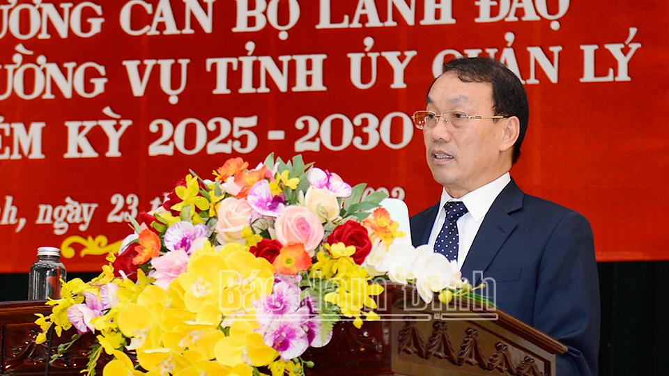 Sáng 23-10, tại Trường Chính trị Trường Chinh, Tỉnh ủy Nam Định phối hợp với Học viện Chính trị Khu vực I (Học viện Chính trị Quốc gia Hồ Chí Minh) tổ chức khai mạc Lớp bồi dưỡng cán bộ lãnh đạo diện Ban TVTU quản lý nhiệm kỳ 2025-2030 (Lớp thứ hai). Các đồng chí Ủy viên Ban TVTU: Nguyễn Văn Va, Trưởng Ban Tổ chức Tỉnh ủy; Nguyễn Mạnh Hiền, Chủ nhiệm Ủy ban Kiểm tra Tỉnh ủy; đại diện Học viện Chính trị Khu vực I, lãnh đạo các Ban Xây dựng Đảng của Tỉnh ủy đã tham dự lễ khai mạc.