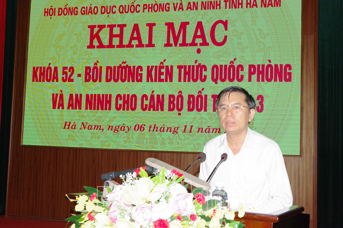 Sáng 6/11, Hội đồng Giáo dục quốc phòng và an ninh (QP&AN) tỉnh tổ chức khai mạc lớp bồi dưỡng kiến thức QP&AN cho cán bộ đối tượng 3 (khoá 52). Đồng chí Trần Xuân Dưỡng, TUV, Phó Chủ tịch UBND tỉnh, Chủ tịch Hội đồng Giáo dục QP&AN dự, phát biểu khai mạc. Cùng dự có đại biểu Hội đồng Giáo dục QP&AN Quân khu 3; các đồng chí lãnh đạo, thành viên Hội đồng Giáo dục QP&AN tỉnh; thủ trưởng Bộ CHQS tỉnh.