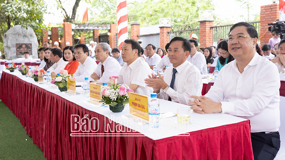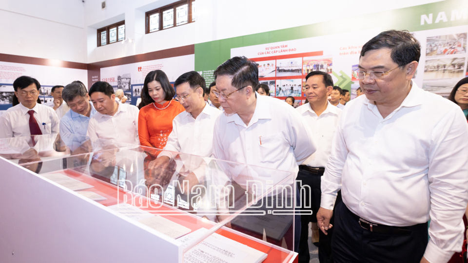 Các đồng chí: Trưởng Ban Tuyên giáo Trung ương Nguyễn Trọng Nghĩa; Bí thư Tỉnh ủy Phạm Gia Túc; Chủ tịch UBND tỉnh Phạm Đình Nghị cùng các đồng chí Ủy viên Ban TVTU: Nguyễn Phùng Hoan, Phó Chủ tịch Thường trực HĐND tỉnh; Trần Anh Dũng, Phó Chủ tịch Thường trực UBND tỉnh; Đoàn Văn Hùng, Chủ tịch Ủy ban MTTQ tỉnh; Phạm Thị Thu Hằng, Trưởng Ban Tuyên giáo Tỉnh ủy; Nguyễn Anh Tuấn, Bí thư Thành ủy Nam Định; lãnh đạo Sở VH, TT và DL đã cắt băng khai mạc Triển lãm.