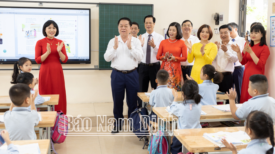 | Đồng chí Trưởng Ban Tuyên giáo Trung ương Nguyễn Trọng Nghĩa và các đồng chí lãnh đạo tỉnh tham quan lớp học trường Tiểu học Nguyễn Tất Thành (thành phố Nam Định). |