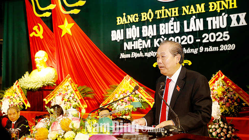 Phát biểu chỉ đạo Đại hội, đồng chí Trương Hòa Bình, Ủy viên Bộ Chính trị, Phó Thủ tướng Thường trực Chính phủ đã nhiệt liệt chúc mừng và biểu dương những thành tựu mà Đảng bộ và nhân dân tỉnh Nam Định đã đạt được trong nhiệm kỳ qua; chỉ ra những mặt cần khắc phục trong thời gian tới, đồng thời định hướng một số vấn đề để Đại hội tiếp tục quan tâm thảo luận, tạo sự nhất trí cao để triển khai thực hiện trong nhiệm kỳ 2020-2025. Đồng chí đề nghị Đại hội phát huy trí tuệ, tinh thần, trách nhiệm, sáng suốt bầu ra BCH Đảng bộ tỉnh khóa XX là những đồng chí có đủ năng lực, phẩm chất, đủ sức lãnh đạo, xây dựng tỉnh ngày càng phát triển (Toàn văn Bài phát biểu của đồng chí Trương Hòa Bình đăng trên Báo Nam Định điện tử).