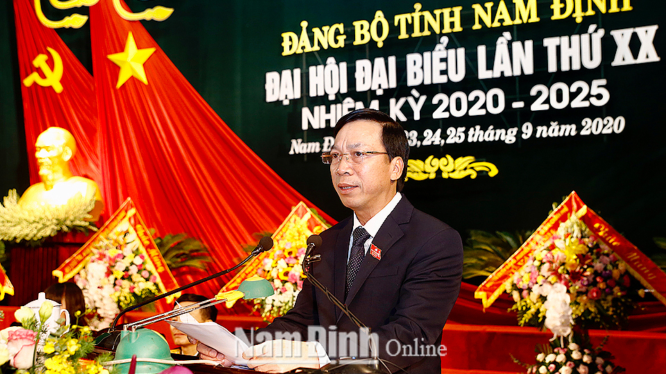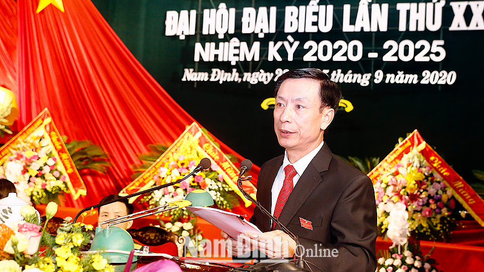 Đồng chí Phạm Đình Nghị, Phó Bí thư Tỉnh ủy, Chủ tịch UBND tỉnh trình bày Dự thảo Báo cáo chính trị của BCH Đảng bộ tỉnh khóa XIX trình Đại hội lần thứ XX. Nhiệm kỳ 2015-2020, trong bối cảnh còn nhiều khó khăn, thách thức, song dưới sự lãnh đạo của Bộ Chính trị, Ban Bí thư; sự phối hợp, giúp đỡ của các ban, bộ, ngành Trung ương; BCH, Ban Thường vụ Tỉnh ủy đã đoàn kết, thống nhất tập trung lãnh đạo, chỉ đạo thực hiện thắng lợi toàn diện các lĩnh vực: Xây dựng Đảng và hệ thống chính trị; phát triển kinh tế - xã hội; quốc phòng, an ninh đạt được nhiều kết quả nổi bật, tạo dấu ấn rõ nét: 15/15 chỉ tiêu chủ yếu đều đạt và vượt kế hoạch. Lĩnh vực sản xuất nông nghiệp và xây dựng nông thôn mới đạt kết quả nổi trội so với cả nước. Nam Định là một trong hai tỉnh đầu tiên của cả nước hoàn thành chương trình xây dựng nông thôn mới, về đích sớm hơn 1,5 năm so với Nghị quyết Đại hội Đảng bộ tỉnh lần thứ XIX, sớm hơn 11,5 năm so với Chương trình mục tiêu quốc gia xây dựng nông thôn mới. Việc huy động các nguồn lực cho đầu tư phát triển có bước chuyển biến tích cực theo hướng tăng nguồn lực xã hội hóa. Nhiều công trình kết cấu hạ tầng trọng điểm được đầu tư tạo điều kiện thúc đẩy kinh tế phát triển cũng như thu hút đầu tư làm nền tảng cho sự phát triển trong nhiệm kỳ tới. Lĩnh vực văn hóa - xã hội tiếp tục phát triển toàn diện. Giáo dục - Đào tạo của tỉnh giữ vững thành tích 25 năm liên tục trong tốp dẫn đầu cả nước. Công tác tổ chức xây dựng, chỉnh đốn Đảng được thực hiện hiệu quả, có nhiều chuyển biến tích cực. Quốc phòng, an ninh chính trị, trật tự an toàn xã hội được giữ vững... Nhiệm kỳ 2020-2025, Đảng bộ tỉnh Nam Định tiếp tục khơi dậy truyền thống văn hiến, anh hùng, sức mạnh đại đoàn kết toàn dân, huy động và sử dụng hiệu quả mọi nguồn lực, nhất là nguồn lực con người để xây dựng tỉnh Nam Định phát triển nhanh và bền vững. Phấn đấu đến năm 2030, Nam Định là tỉnh phát triển khá của cả nước.