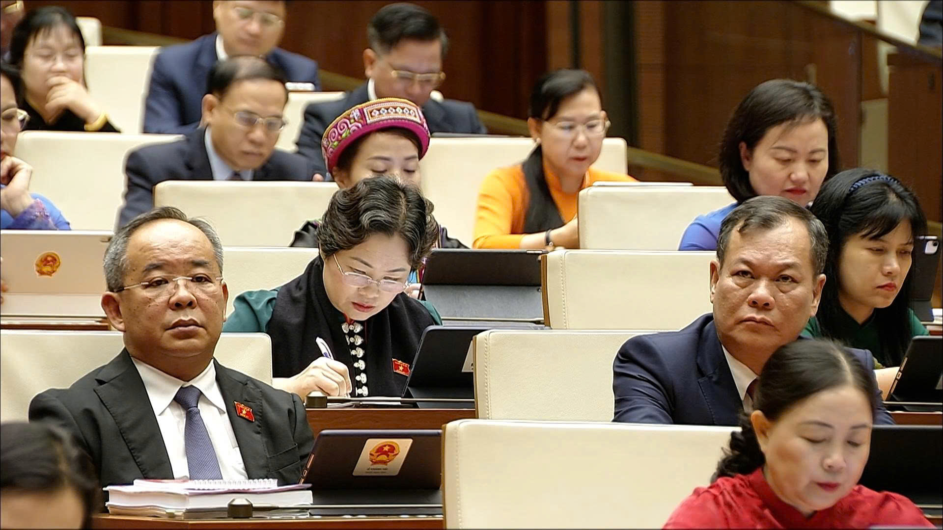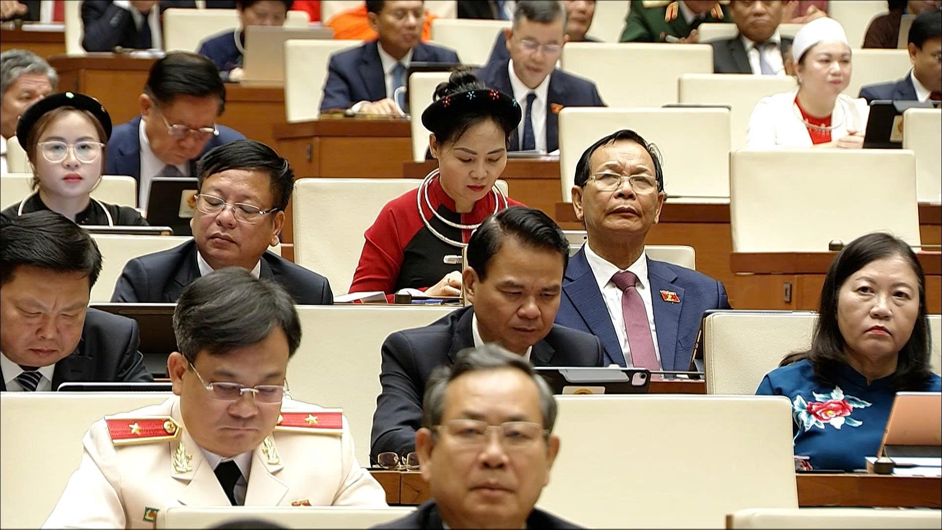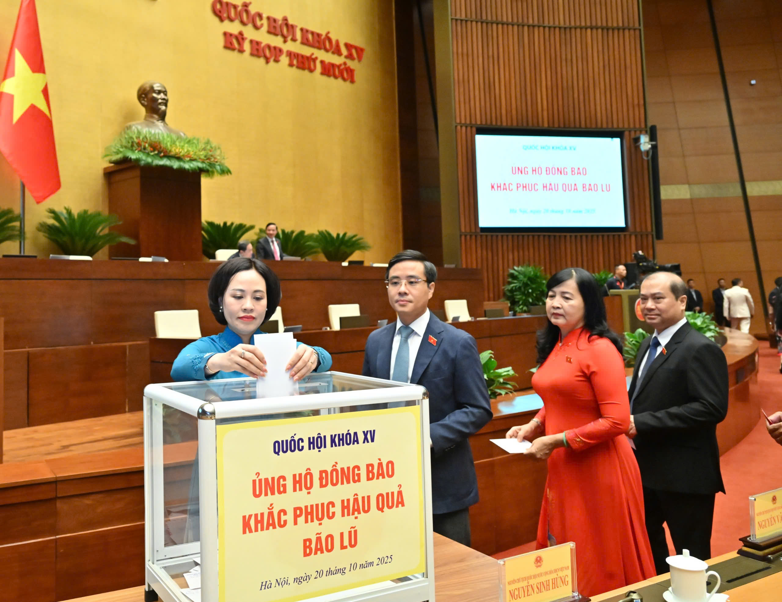 Chủ tịch nước Lương Cường và các đại biểu ủng hộ đồng bào khắc phục hậu quả bão lũ. Ảnh: VTVĐại biểu Quốc hội tỉnh Ninh Bình ủng hộ đồng bào khắc phục hậu quả bão lũ. (Ảnh do Đoàn đại biểu Quốc hội tỉnh cung cấp)Quang cảnh kỳ họp. Ảnh: VTV