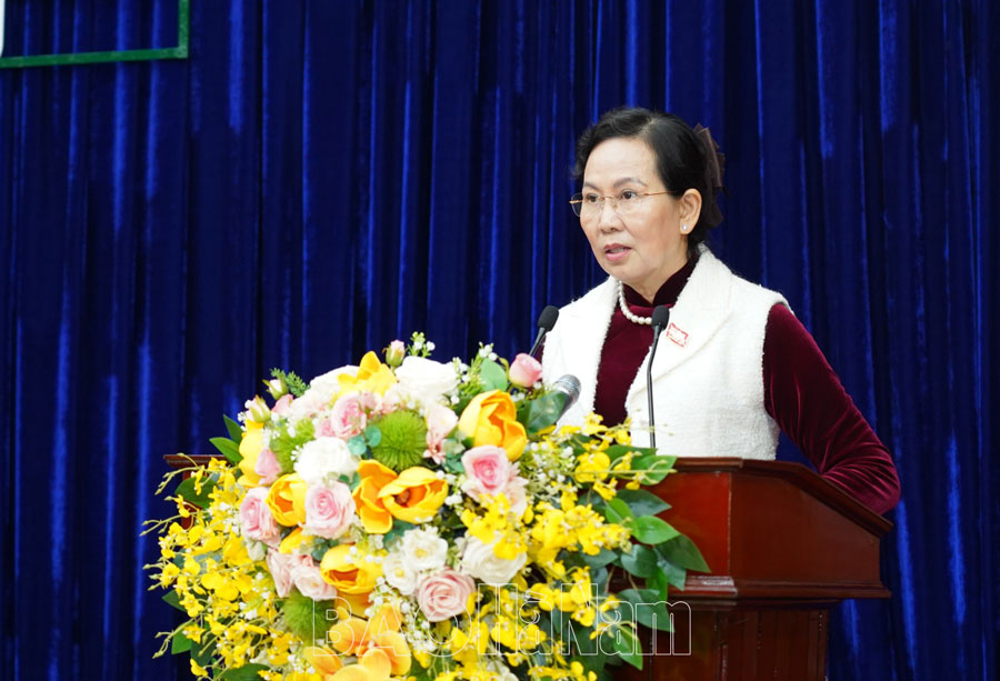 Đồng chí Trần Thị Ngân, Ủy viên BTV Tỉnh ủy, Chủ tịch Ủy ban MTTQ tỉnh trình bày Thông báo của Ủy ban MTTQ tỉnh về công tác mặt trận tham gia xây dựng chính quyền năm 2023 và báo cáo tổng hợp ý kiến, kiến nghị của cử tri trong tỉnh với kỳ họp thường lệ cuối năm 2023, HĐND tỉnh khóa XIX.