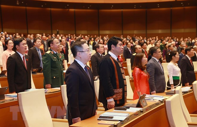 | Các đại biểu Quốc hội thực hiện nghi thức chào cờ. |