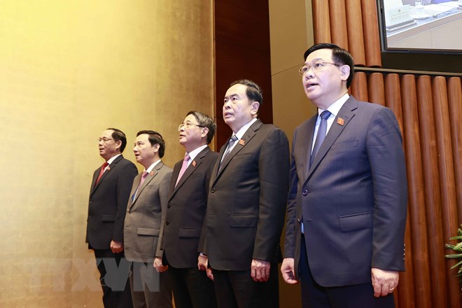 | Chủ tịch Quốc hội Vương Đình Huệ và các Phó Chủ tịch Quốc hội thực hiện nghi thức chào cờ. |